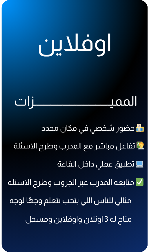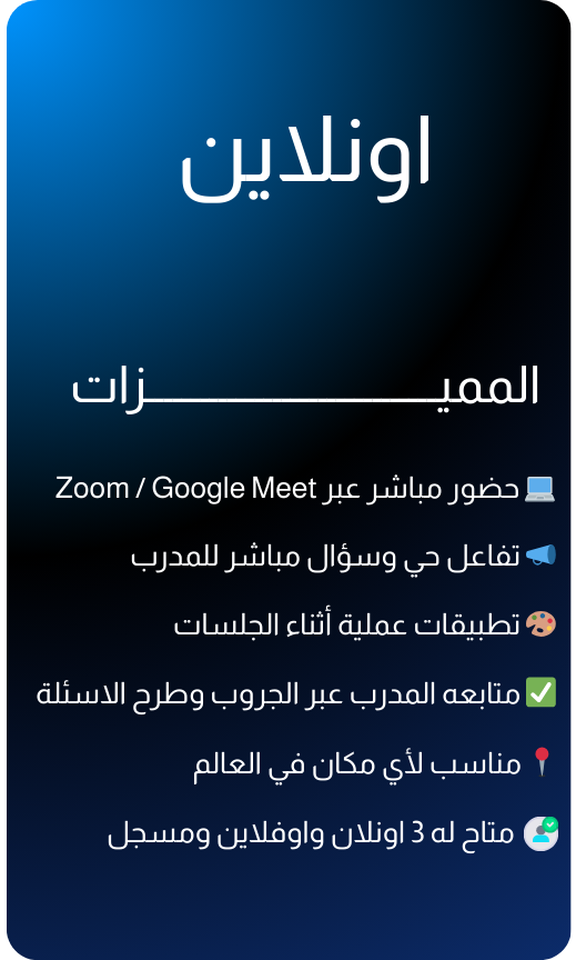 - مدة الكورس هتكون 40 يوم – 16 محاضرة، مدة المحاضرة من ساعة لساعتين، 3 أيام أسبوعياً سواء أوفلاين في مقر الشركة أو أونلاين بث مباشر على زوم، وهنتعرف على كل محاضرة هنعمل فيها إيه، وكلو بالموبايل مش محتاج لابتوب